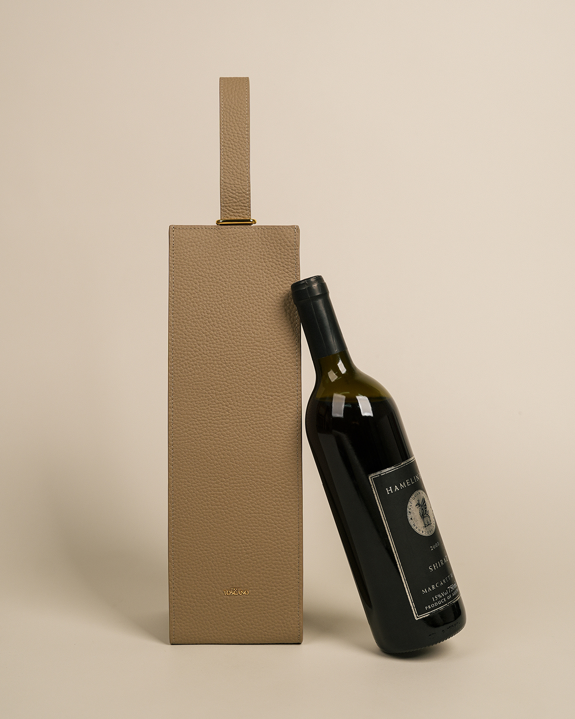 A refined carrier for your wine—sleek, boxy, and designed for slimmer bottles. A metal loop closure ensures security and effortless carry, making it perfect for soirées, celebrations, and sparking conversation.