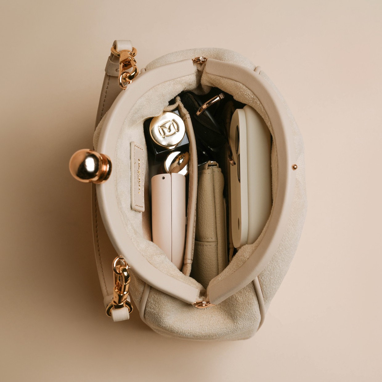 A charming puffed shape top handle designed for effortless, easygoing days. Inside, you’ll find a dedicated phone compartment and a gusseted pocket for your everyday tech and essentials. Its luxurious suede finish adds a refined touch, ideal for classy brunches or relaxed evening outings. Clip on the long adjustable strap to wear it hands-free.