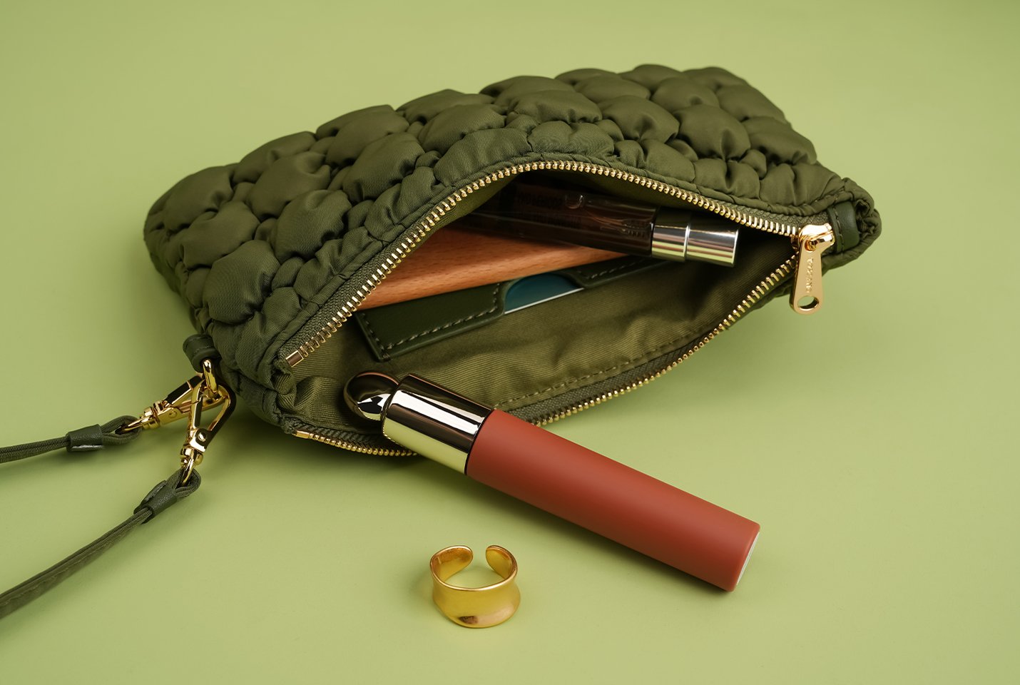 Less is more with this versatile pouch made from recycled polyester. This compact must-have features a main compartment for your tissues, lipstick and valuables. Keep your travel or credit card in the interior card slot to access it easily. Wear it by its wristlet strap or detach it to stow the pouch in bigger bags—a handy feature when travelling.