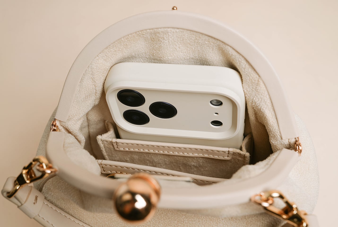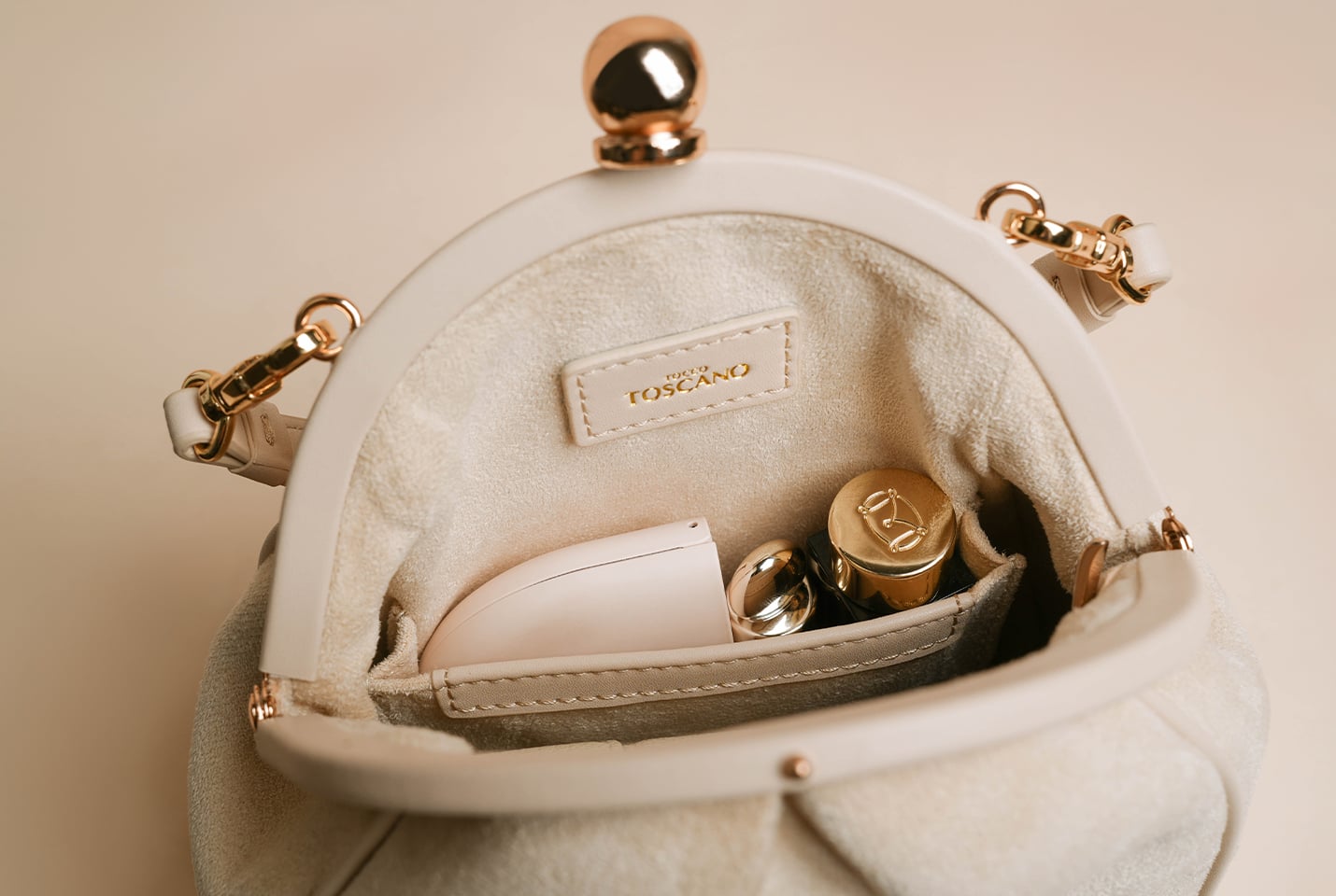 A charming puffed shape top handle designed for effortless, easygoing days. Inside, you’ll find a dedicated phone compartment and a gusseted pocket for your everyday tech and essentials. Its luxurious suede finish adds a refined touch, ideal for classy brunches or relaxed evening outings. Clip on the long adjustable strap to wear it hands-free.