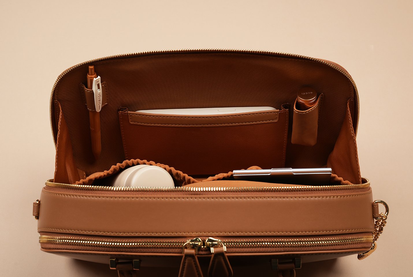 Polished enough for special occasions, practical enough for everyday. This piece features 2 roomy main compartments, elastic slots, a lipstick holder, a pen holder, and additional pockets for organisation. Pair it with the adjustable bag strap for a hands-free style.