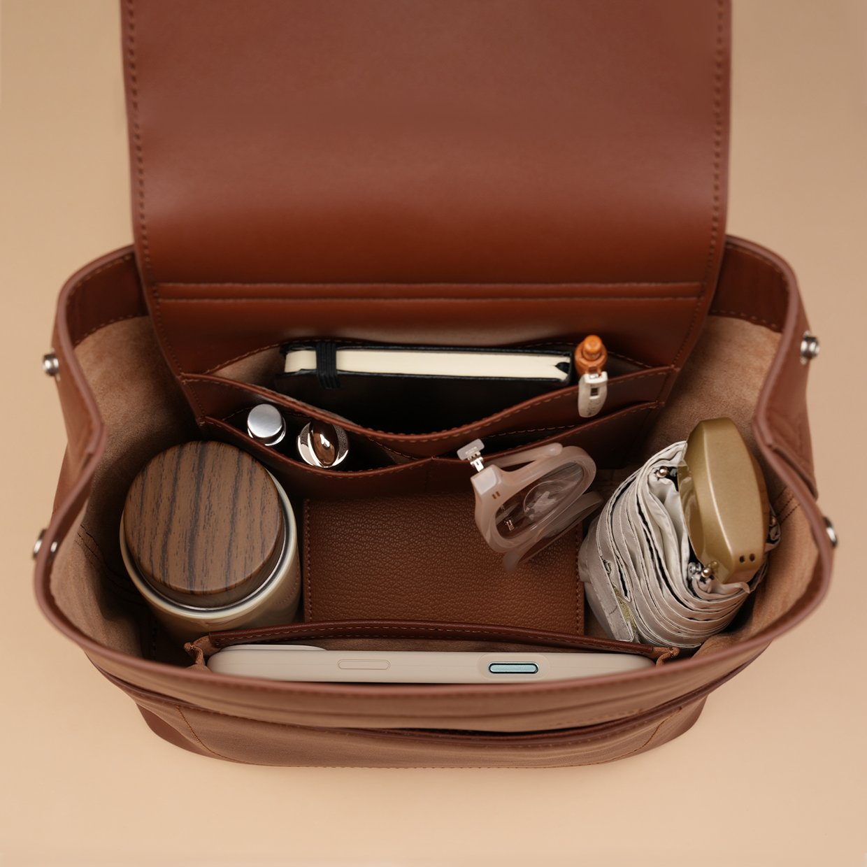 The foundation for an effortlessly chic aesthetic—this sleek backpack features a spacious front pocket, a suede-lined interior large enough for daily essentials, and a top flap with a hidden magnetic closure to keep your items safe. Its main compartment includes a phone slot, a large slip pocket, and 2 extra smaller pockets for pens or other must-haves. Snap buttons on both sides of the bag let you expand its opening fully, so you can reach for your items with ease. Wear it at your preferred length by adjusting the straps. It's the everyday carry you've been waiting for.