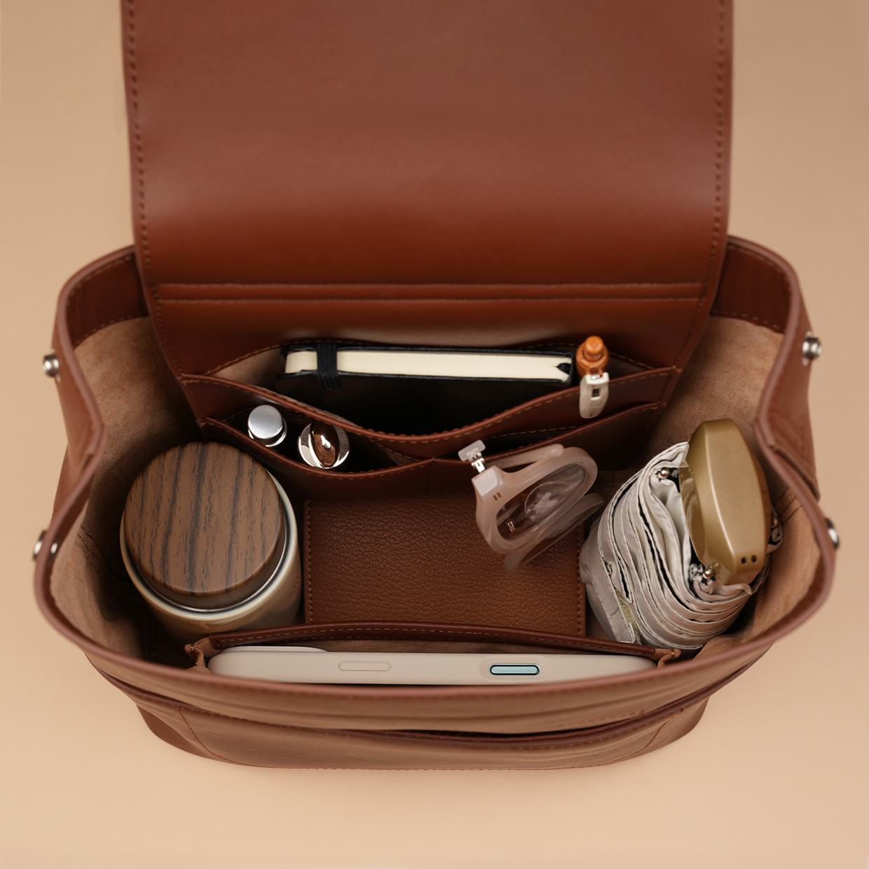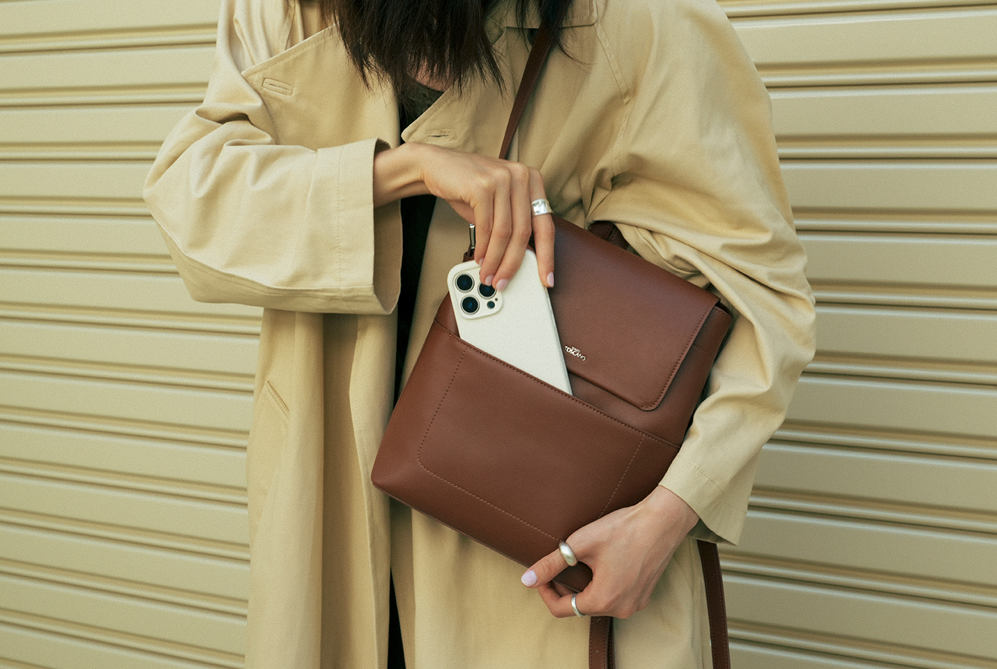 Place necessities in the front pocket to reach for them quickly—a hidden magnetic closure ensures they stay in place.