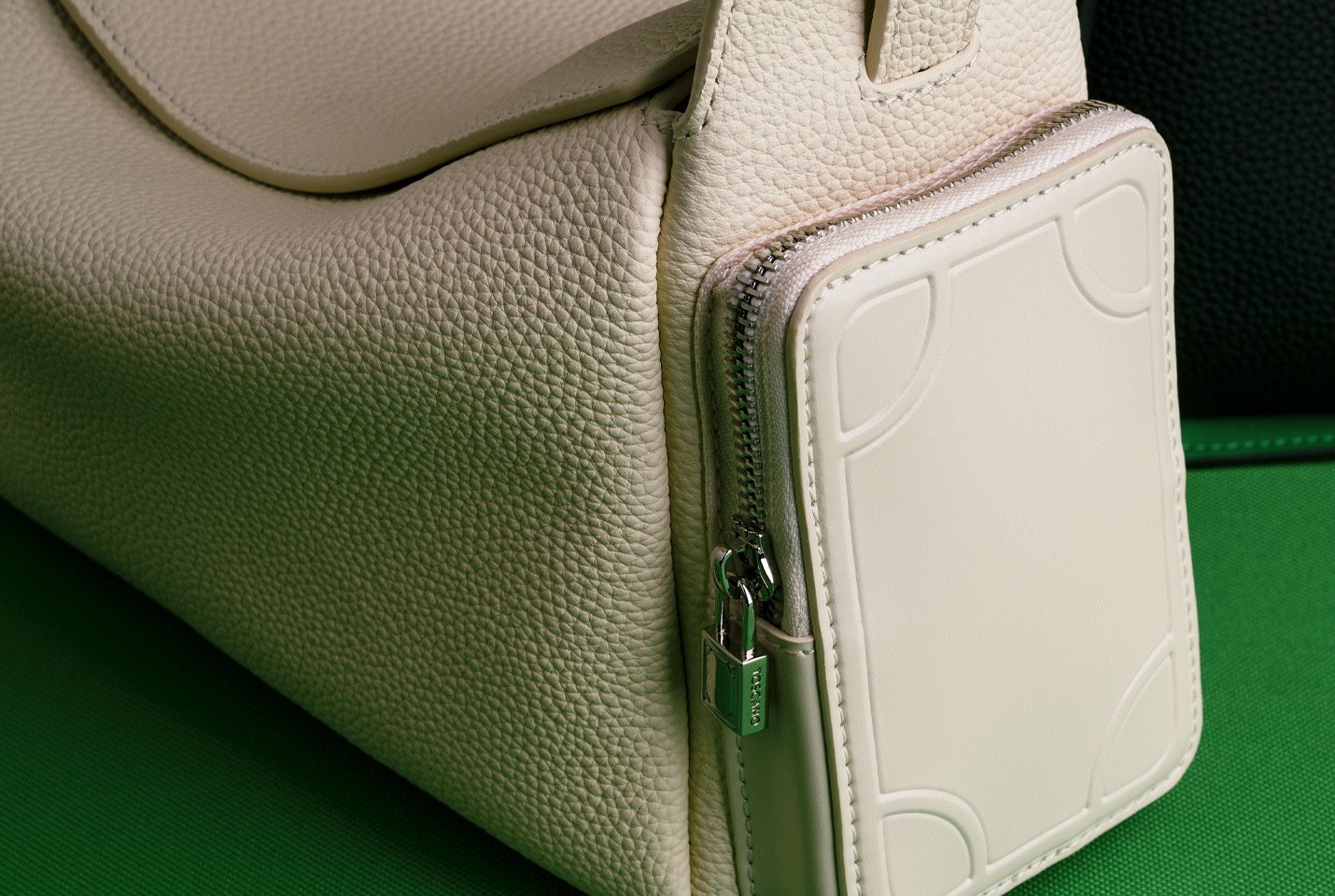 The same signature border appears on the bag’s tile-shaped zipper pullers, continuing the aesthetic.