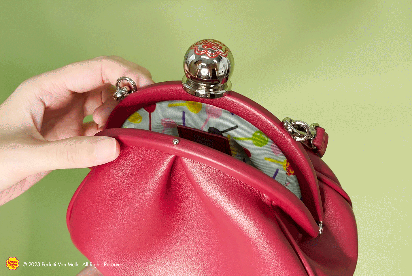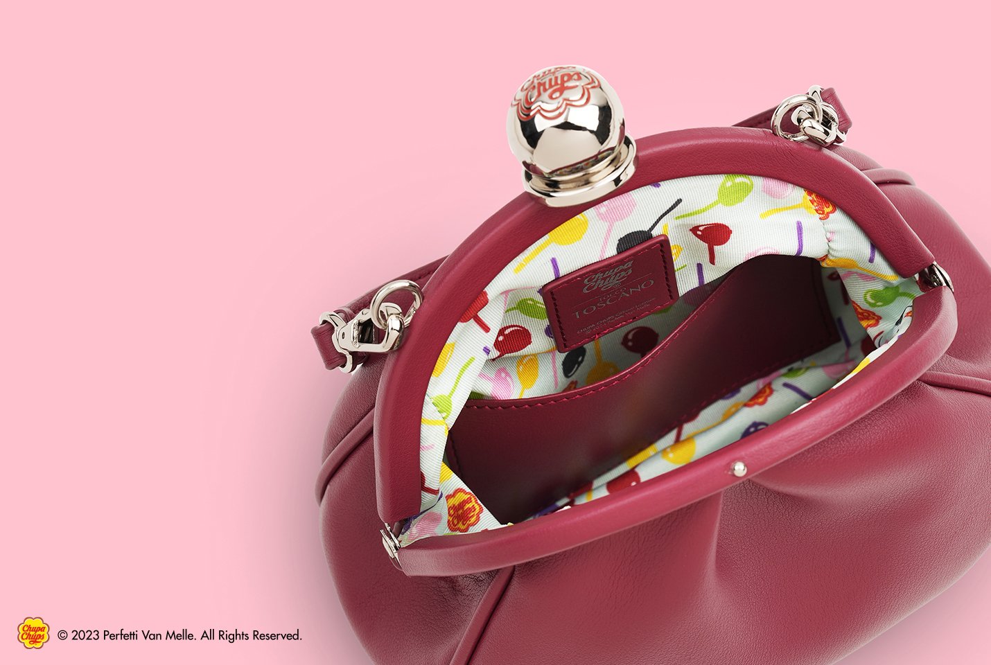 The Chupa Chups lollipop clasp secures your bag while accentuating the bag’s round silhouette.