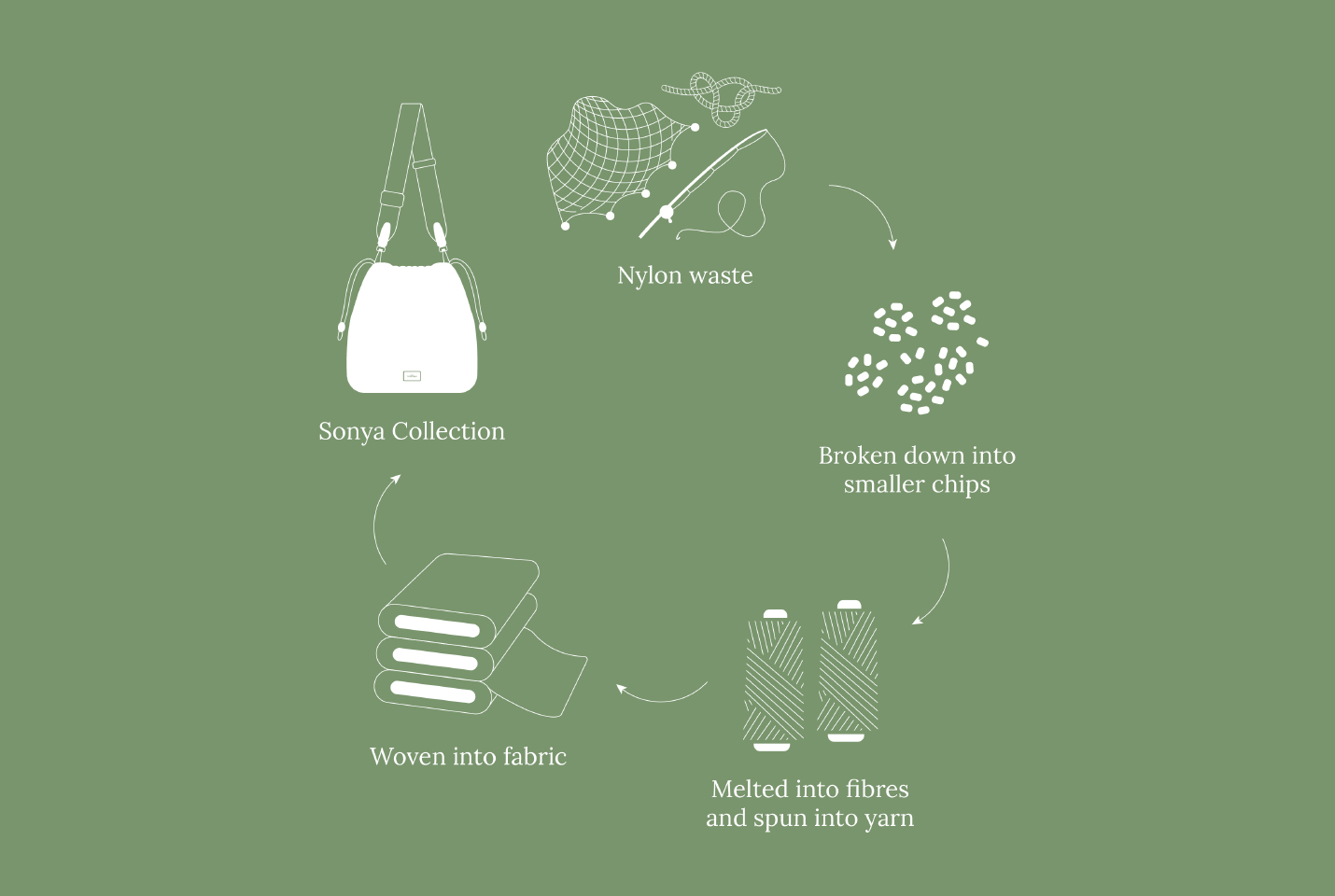 Nylon waste such as fishing nets and cables are broken down into smaller chips before being melted into fibres and spun into yarn. The yarn is then woven into the fabric that makes up our bags.