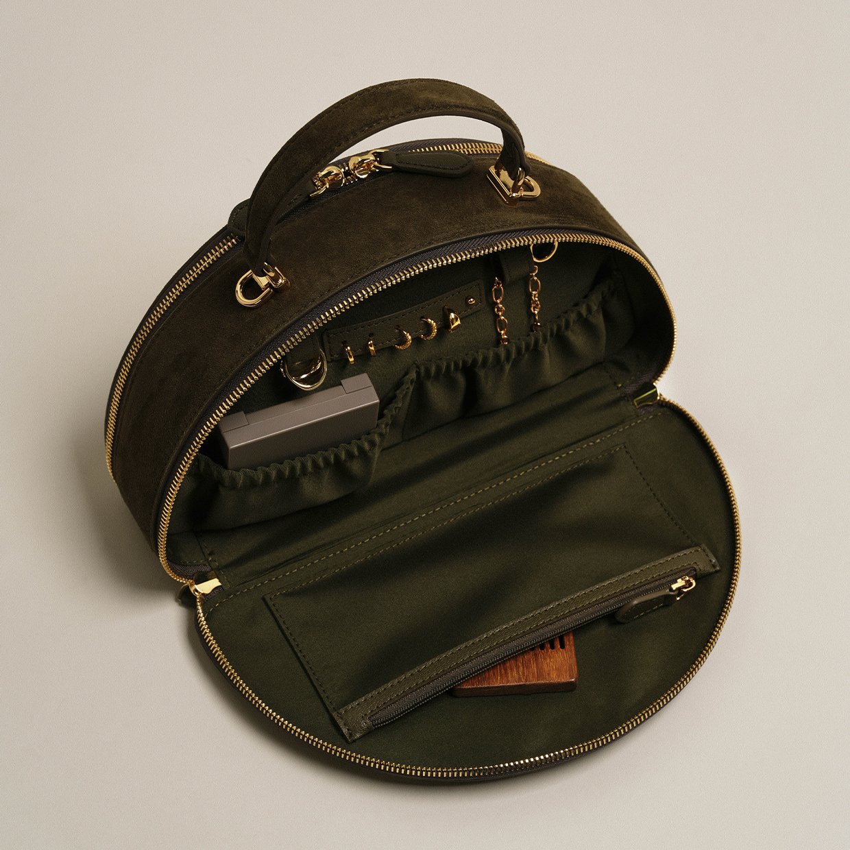 In soft suede with a structured frame, this showstopper offers spacious dual compartments for all your essentials. It has plenty of pockets for organisation, plus a bonus holder for your earrings. Style it with sophistication or switch it up with the shoulder strap.