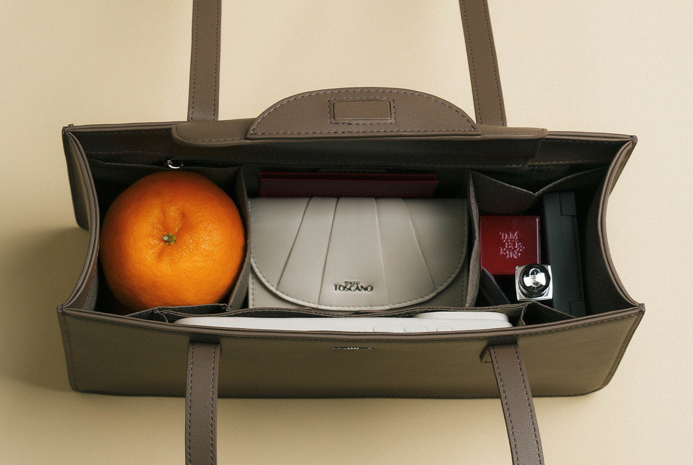 Made for Lunar New Year visits and celebrations, this structured shoulder bag keeps your oranges safely tucked away in clever retractable pockets, with compartments for your phone, card, and other essentials—all wrapped in a sleek, statement-making silhouette.