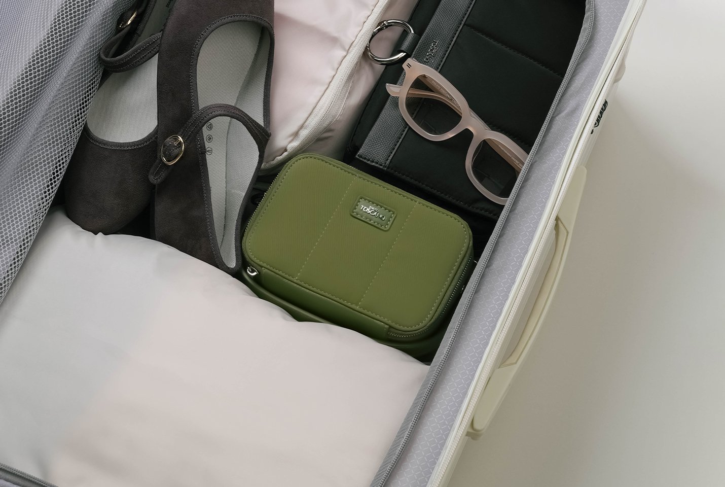 Compact enough for your suitcase or carry-on, with a firm shape that protects what’s inside.