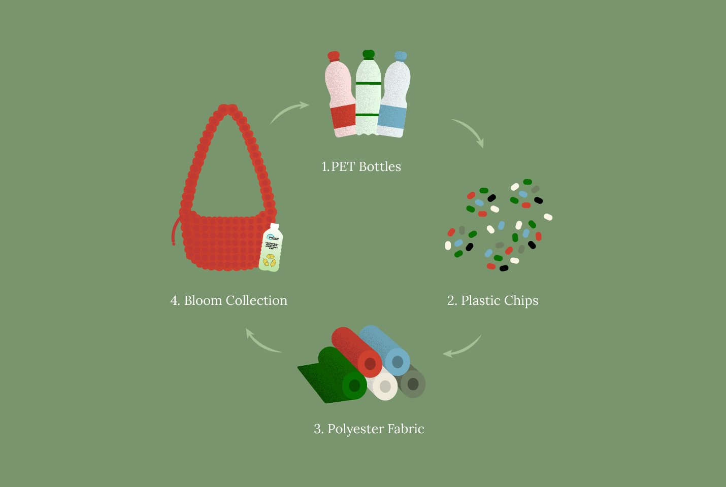 This GRS-certified material is produced by shredding PET bottles into chips, melting the chips into fibres, and then spinning them into a polyester fabric.