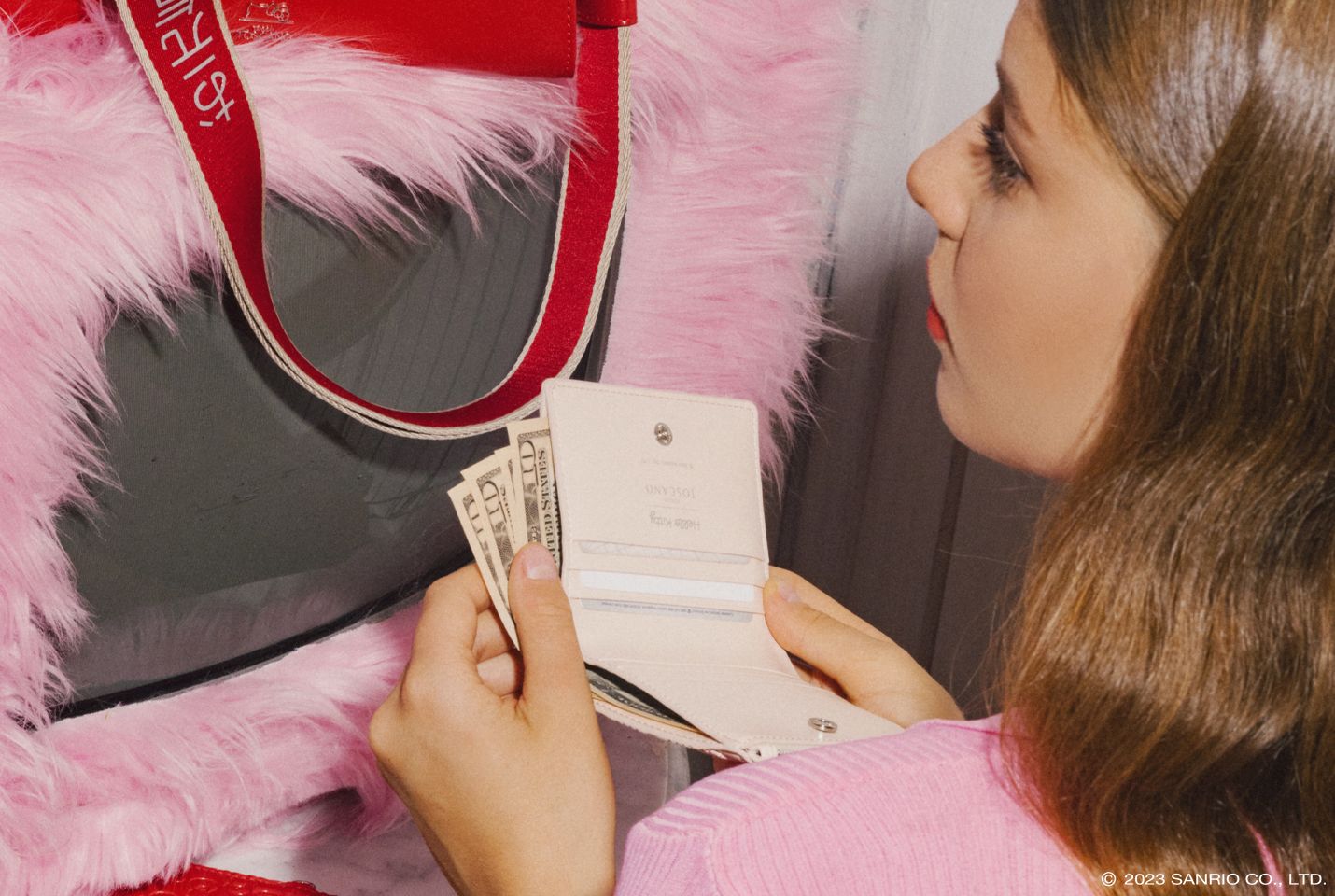 Head to friendly brunches with this small, compact bifold wallet in tow. The subtle monogram of Hello Kitty’s iconic bow adds the slightest pop to your outfit, contrasted by a striking interior pattern of four Hello Kitty expressions. This everyday wallet holds cash, coins and up to 6 cards while its compact size ensures it slips easily into bags of any size.