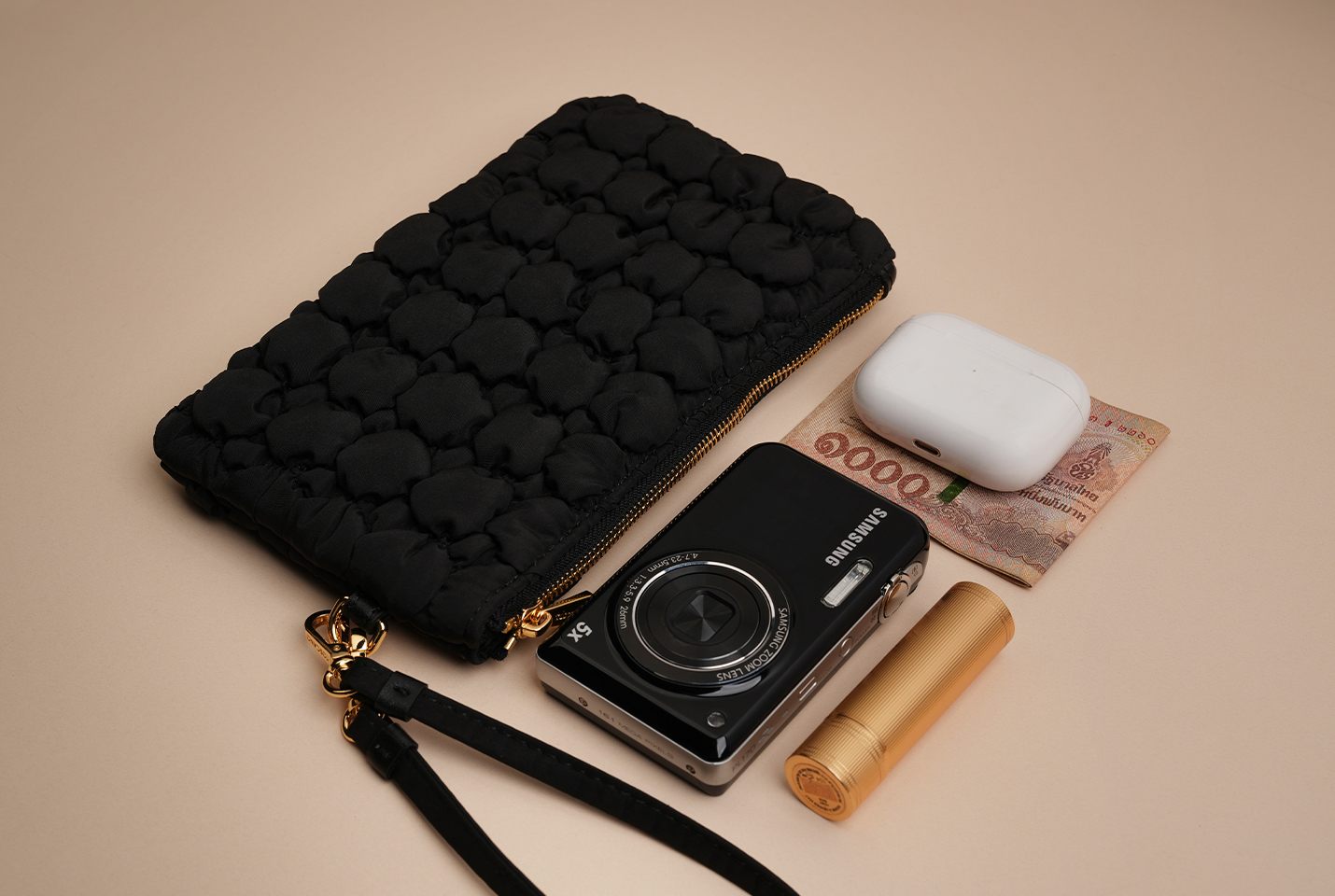 Less is more with this versatile pouch made from recycled polyester. This compact must-have features a main compartment for your tissues, lipstick and valuables. Keep your travel or credit card in the interior card slot to access it easily. Wear it by its wristlet strap or detach it to stow the pouch in bigger bags—a handy feature when travelling.