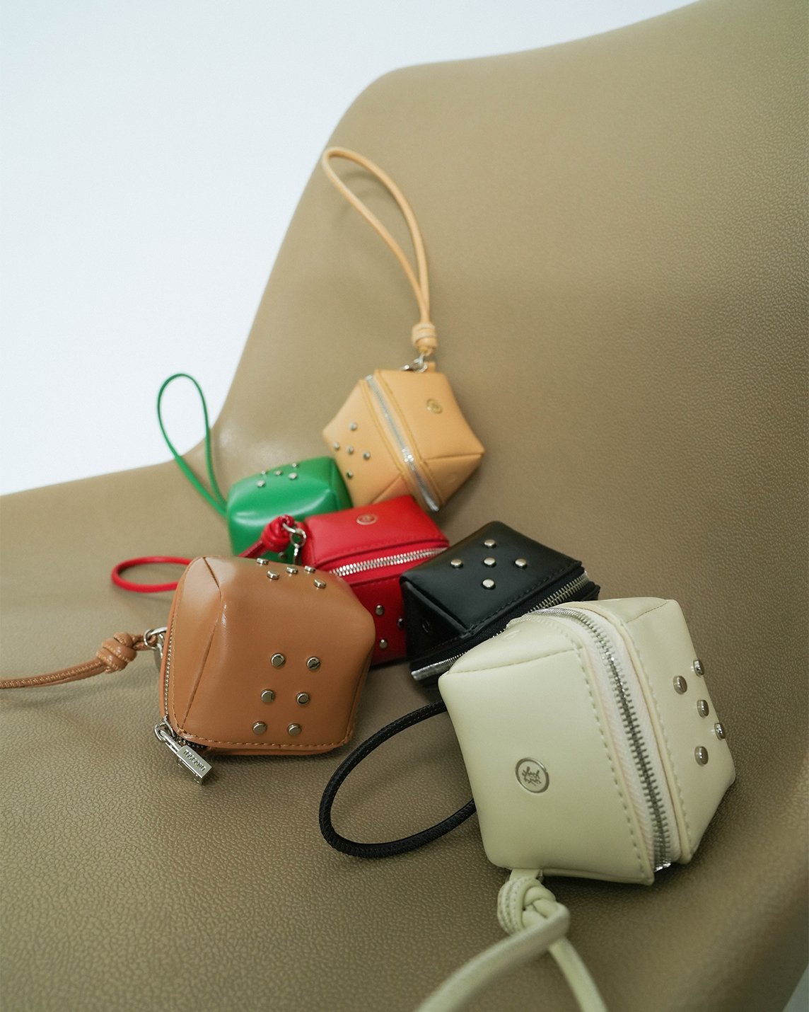 A bold dice-shaped bag charm made to house your mini essentials and more.