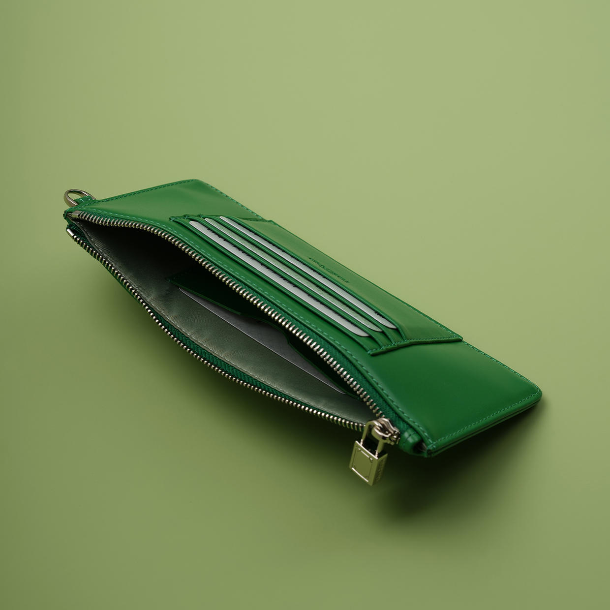 Prefer carrying light? This sleek slim card wallet is your match. Subtle Mahjong-inspired details like the Green Dragon tile's character (發) and the White Dragon tile's iconic border elevate its minimalist design. A zip compartment keeps cash and coins safe, while exterior card slots give you easy access to your cards on the go. An additional interior card slot keeps your travel card separate and still easily accessible.
