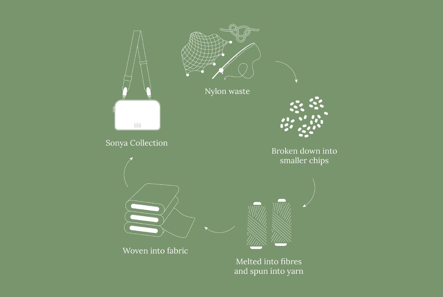 Nylon waste such as fishing nets and cables are broken down into smaller chips before being melted into fibres and spun into yarn. The yarn is then woven into the fabric that makes up our bags.