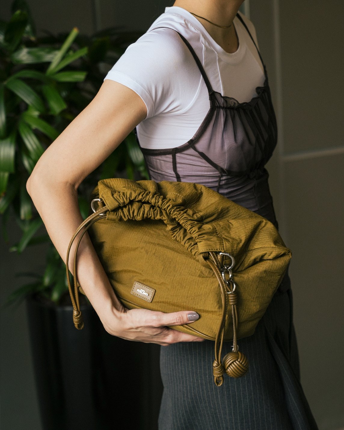 Made from recycled nylon, this enduring piece is ready to take on anything. It has a surprisingly spacious interior, slip pockets to keep your essentials organised, and a drawstring closure for quick and easy access. Wear it as a cool shoulder bag or detach the strap to switch to a clutch.