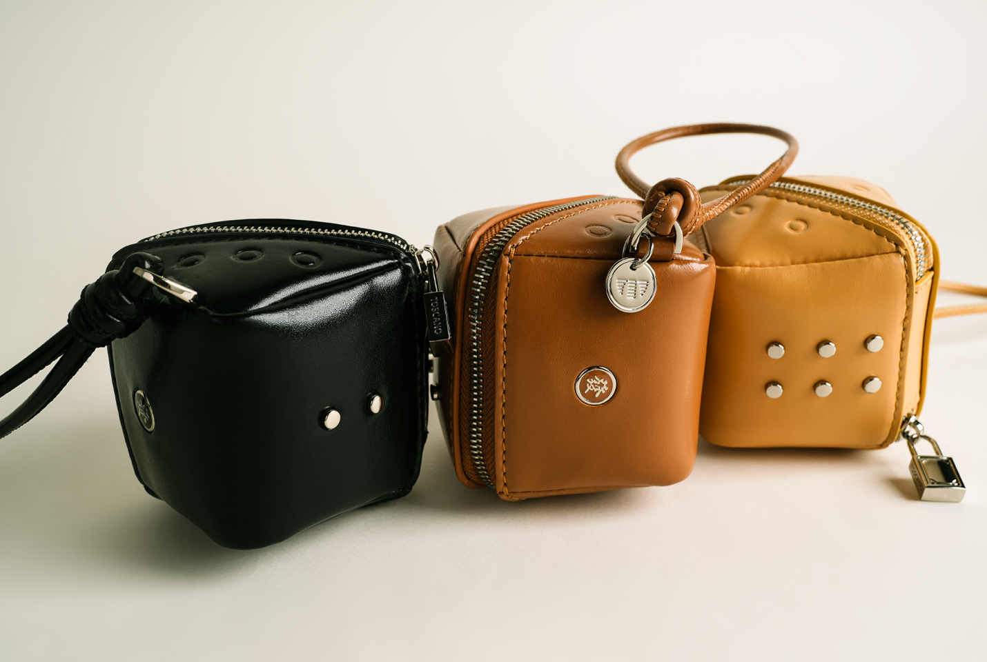 Bring your A-game to any occasion with this boxy and practical bag charm by your side. Designed to resemble a Mahjong die, embossed circles and metal studs adorn each surface to represent the numerical dots. A small enamel circle with the character (發) graces the first side, paying homage to the Green Dragon tile. Tuck your mini essentials in this vegan-friendly piece and be ready to catch everyone's eye.